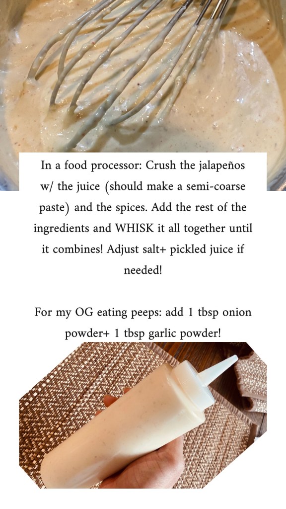 Pro tip: TO KEEP THE SAUCE A LITTLE THICK, BLEND THE JUICE+JALAPEÑOS AND THEN MIX EVERYTHING ELSE WITH A WHISK!