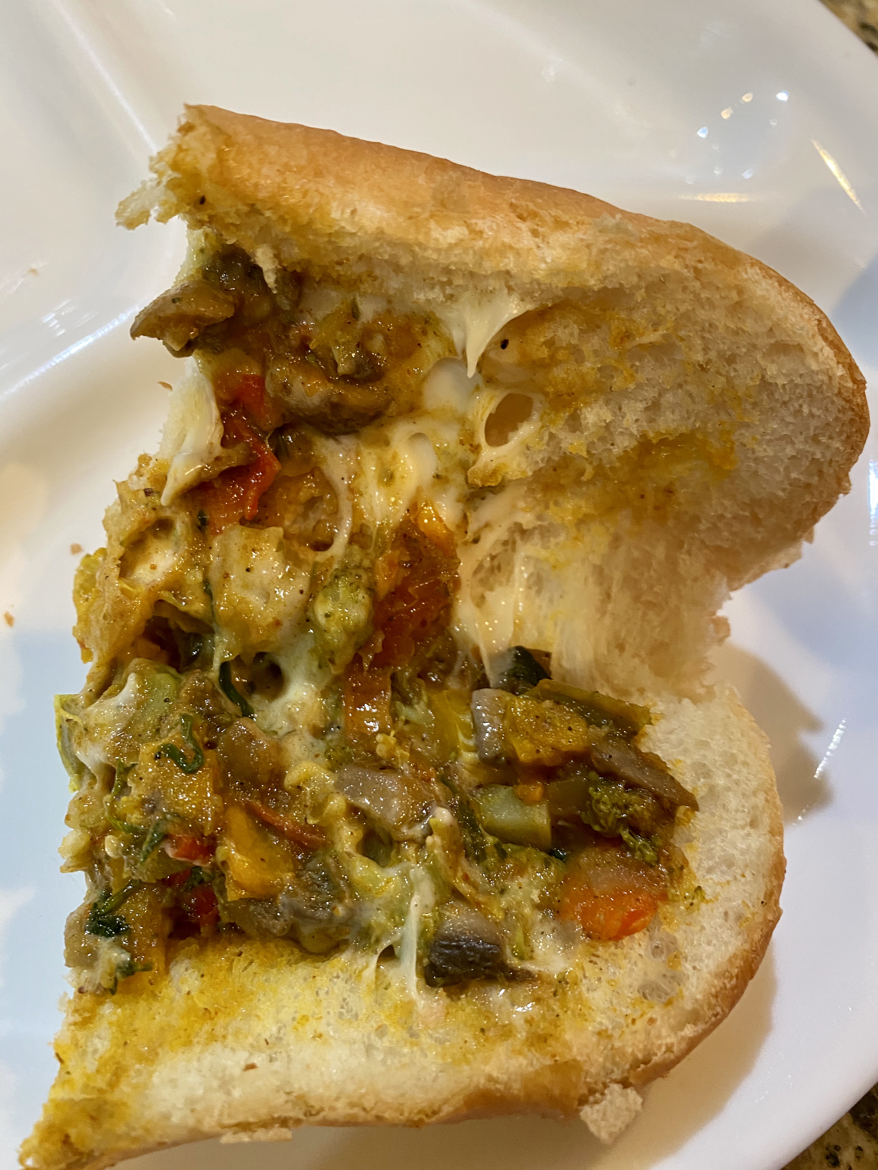 - Once the cheese starts melting, start mixing up the stuffing+melted cheese with 2 spoons, let it sizzzzle a little bit more and then stuff it into a slightly warm sub bread of your choice.